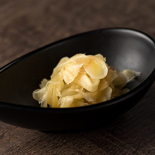 Feito com pimenta togarashi. (Pimenta em pó) Na ausência da pimenta em pó pode ser feito com a geleia feita pela casa.