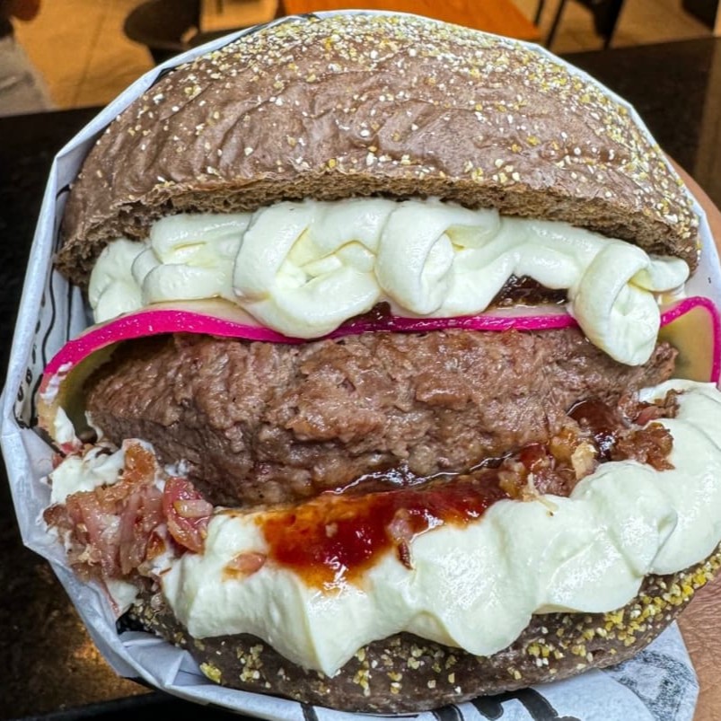 Pão tradicional com gergelim, cream cheese, blend suculento de 150g, cheddar cremoso, geleia de bacon (contém abacaxi) e barbecue