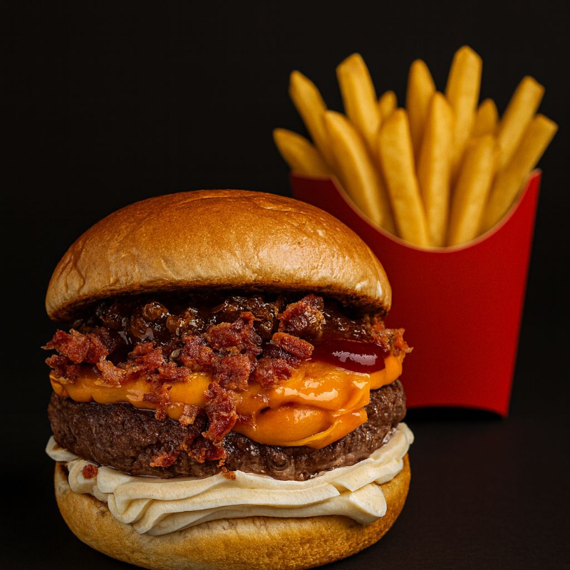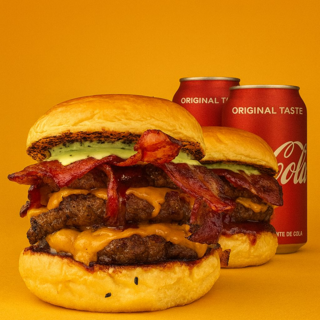 Quanto Mais Bacon, Melhor! Delicioso pão brioche selado, Dois blend 110g com queijo cheddar derretido no vapor, dupla camada de bacon crocante, cebola caramelizada e barbecue