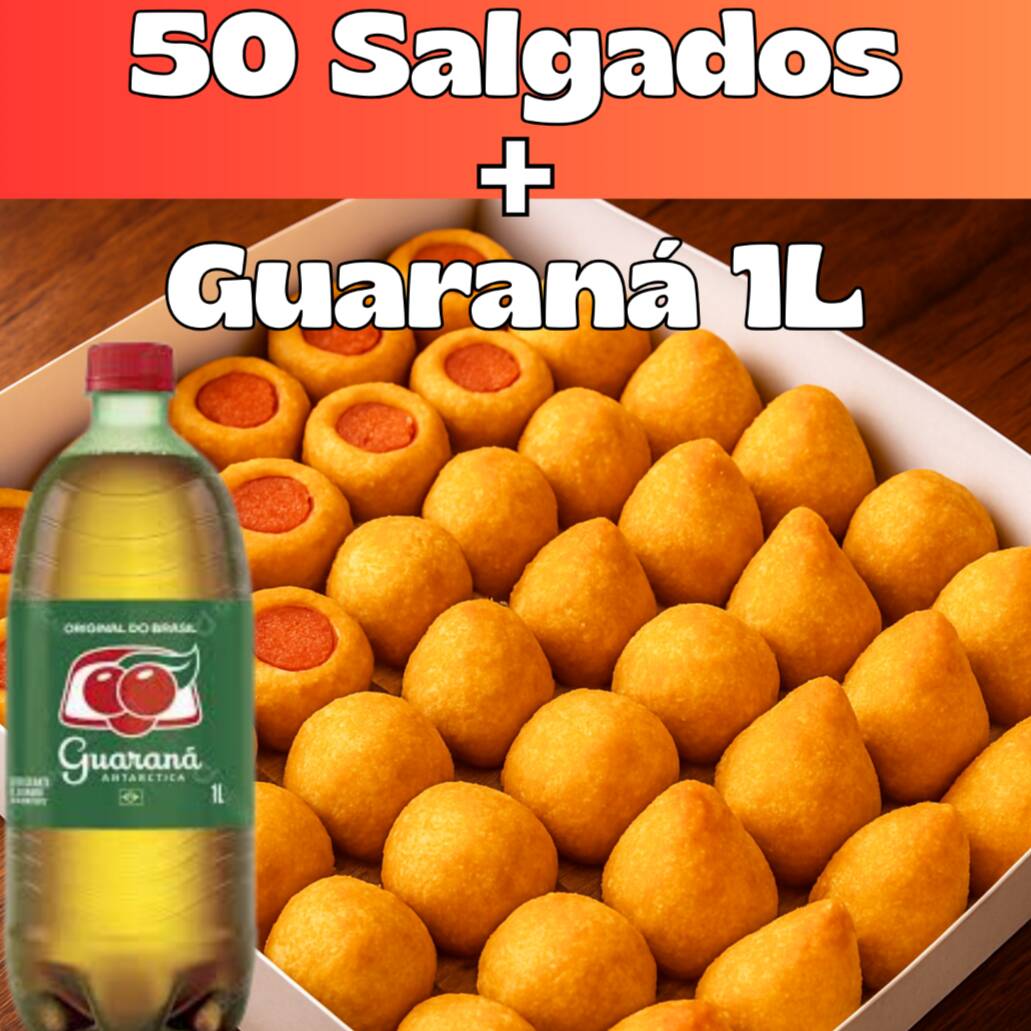 50 Salgados + Guaraná 1L Crocantes, saborosos e prontos pra matar a fome da galera! Combo completo pra curtir em qualquer momento: salgados de qualidade + Guaraná 1L geladinho. Aproveite e garanta o seu agora!