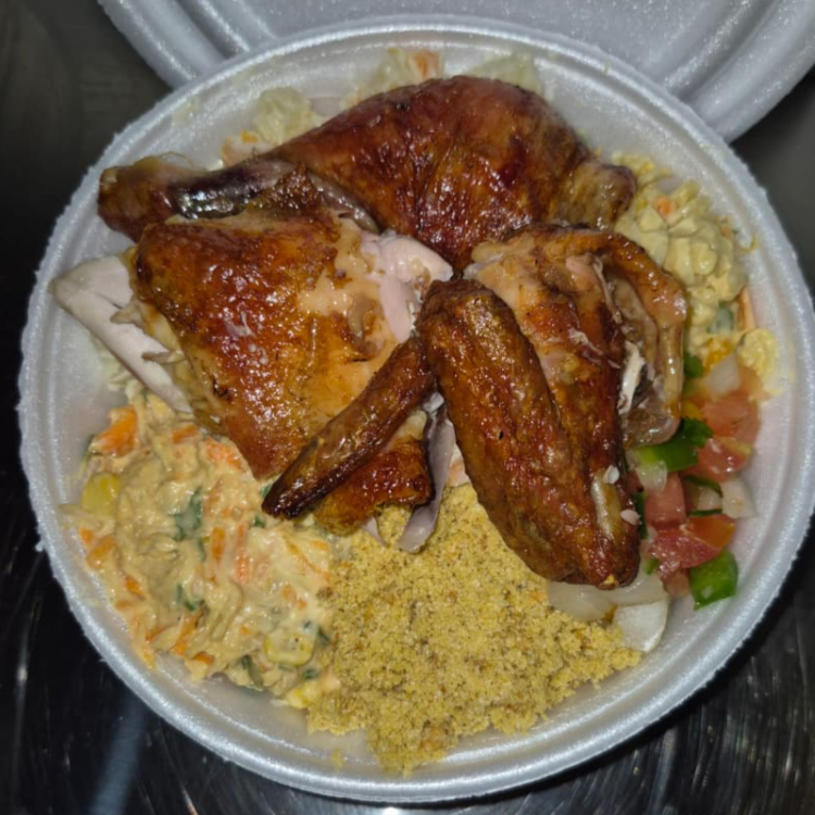 Frango assado, farofa, arroz, molho, salpicão
