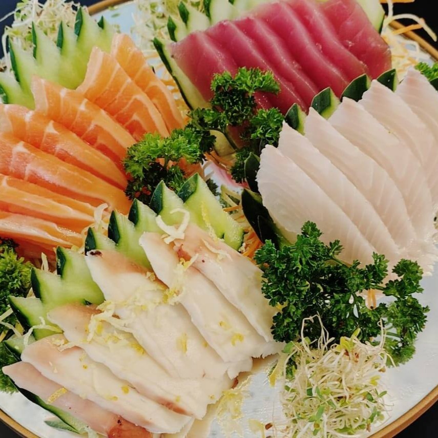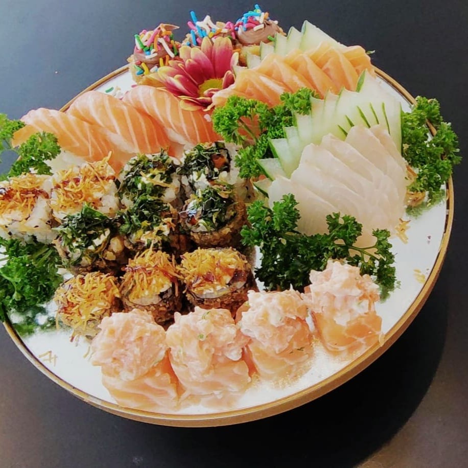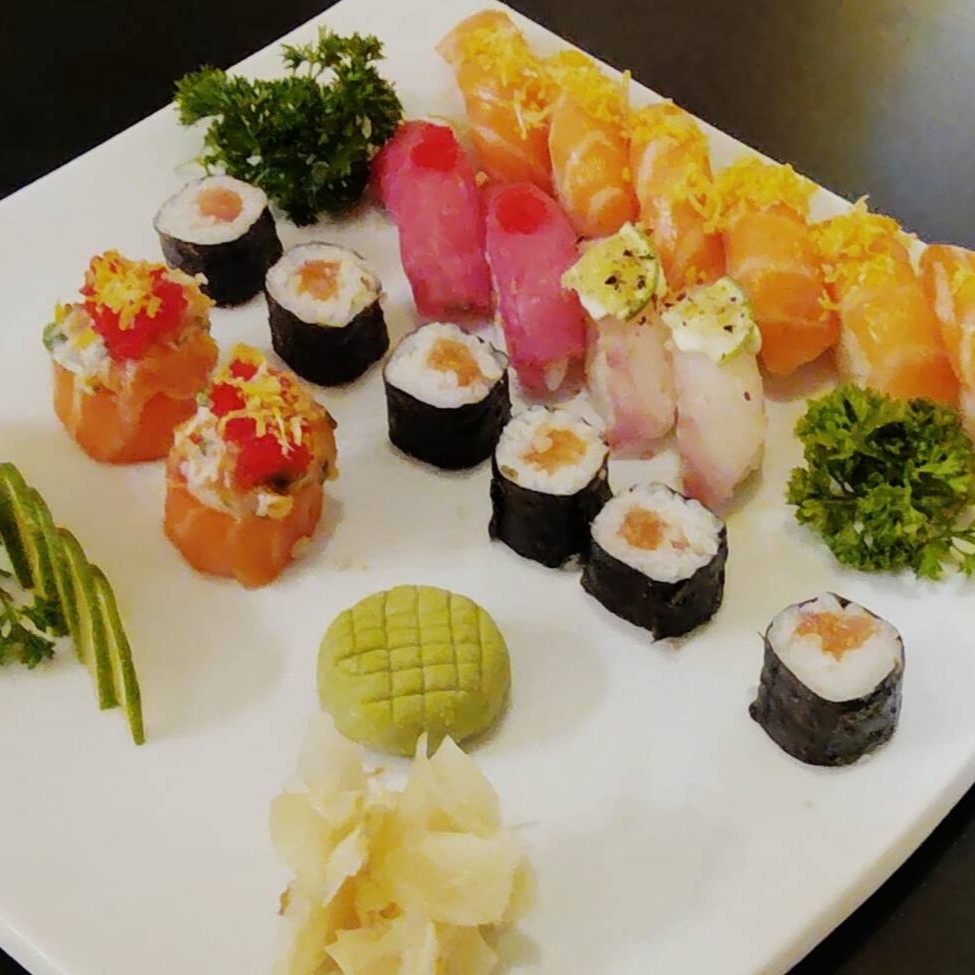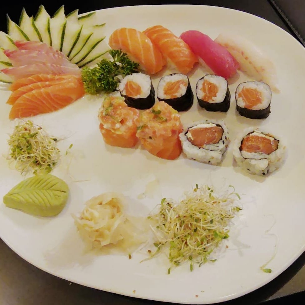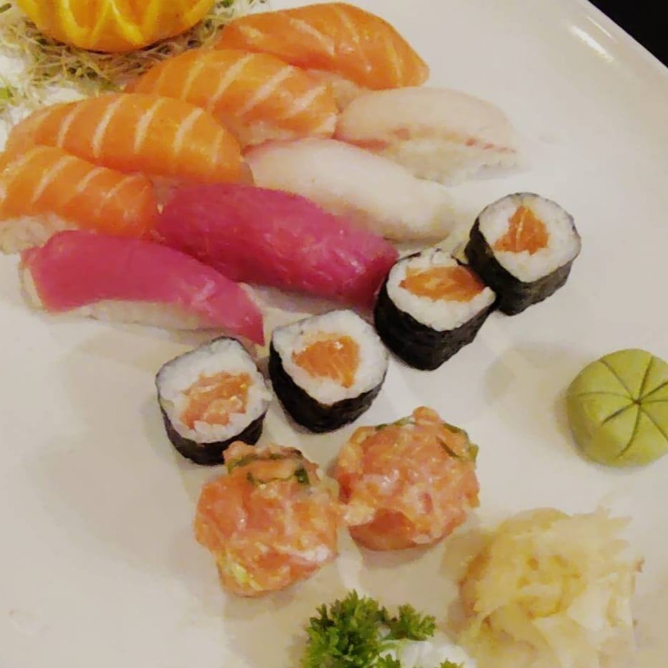 3 sashimi de salmão, 3 sashimi de peixe branco, 4 sushis, 2 jhous, 4 salmonmakis e 2 uramakis