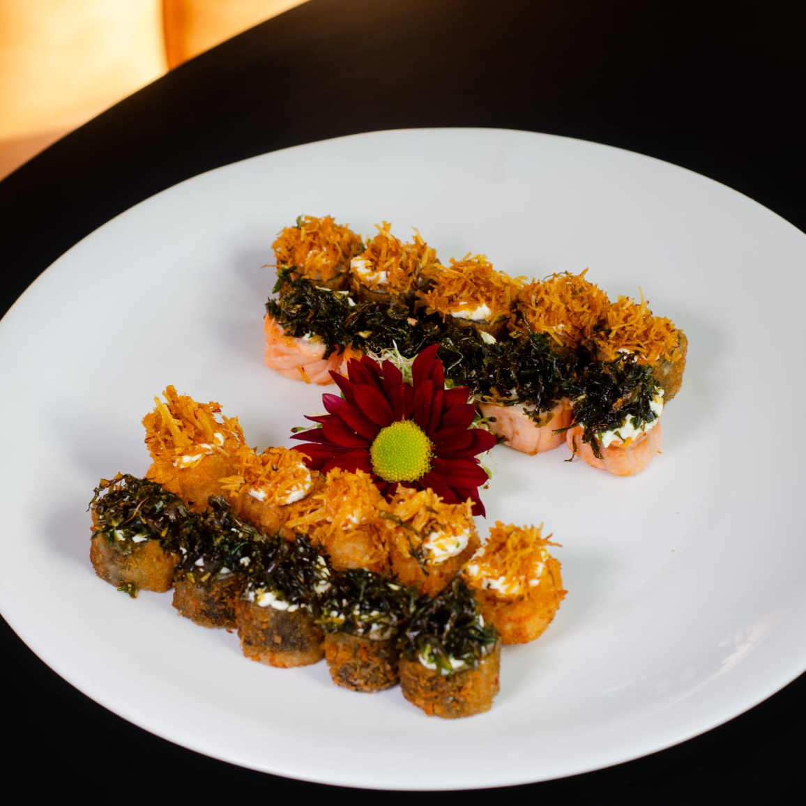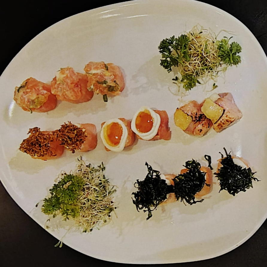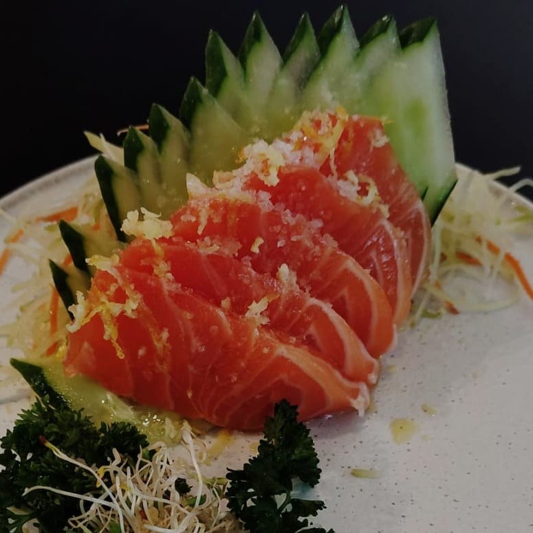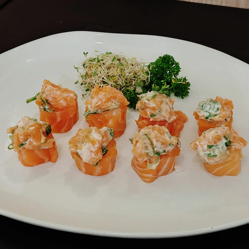 Desfrute de 5 irresistíveis sashimis de salmão, delicadamente temperados com flor de sal, frescas raspas de limão siciliano e um toque especial de azeite trufado. Uma experiência gastronômica única que combina a suavidade do salmão à frescura dos citros e à sofisticação do azeite trufado. Não perca essa explosão de sabores!