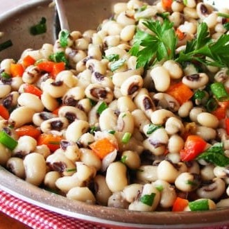 Salada de feijão fradinho com cebola, tomate, pimentão verde, temperado com azeite, vinagre e coentro porção de 300gr