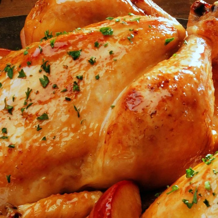 Frango assado suculento com um delicioso tempero, acompanha farofa e batata.(Batata inclusa na mesma embalagem do frango)