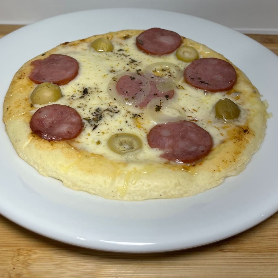 Pizza brotinho coberta de queijo mussarela com azeitona, calabresa e cebola.