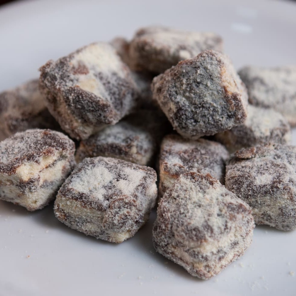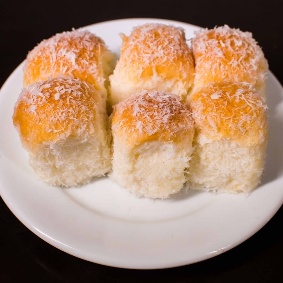 Pão doce recheado com brigadeiro branco, mergulhado no leite de coco e finalizado com coco ralado.