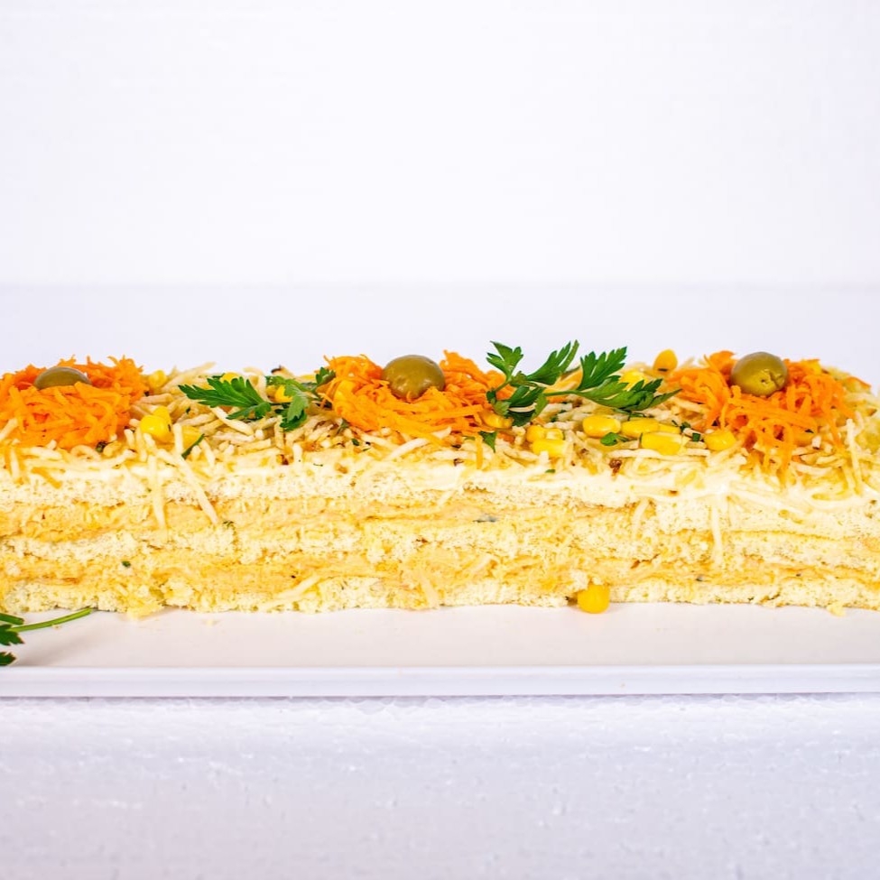 Massa de torta salgada, patê de frango, decorado com cenoura, milho e azeitona