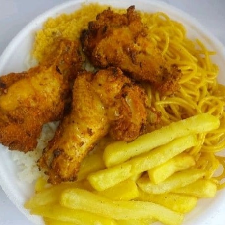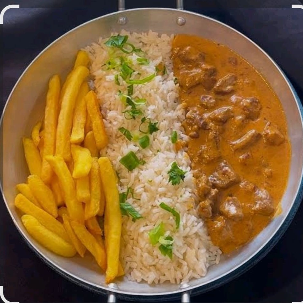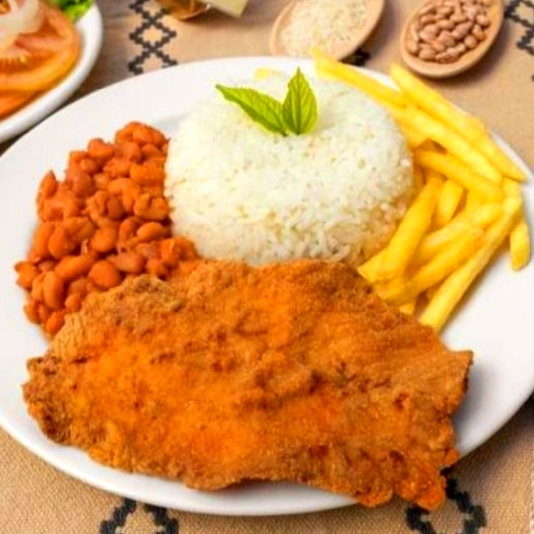 Arroz, feijão, macarrão, farofa purê ou batatas frita.