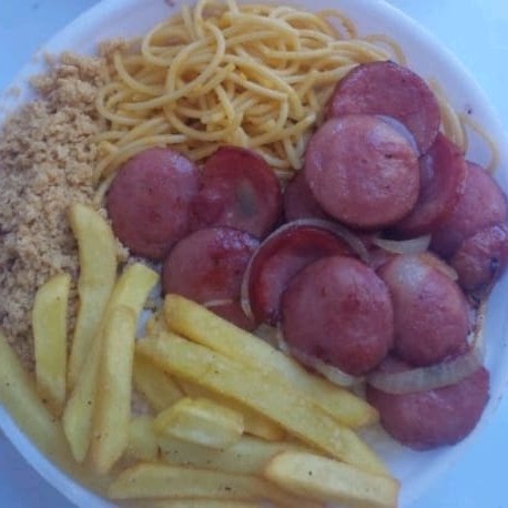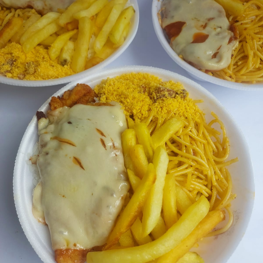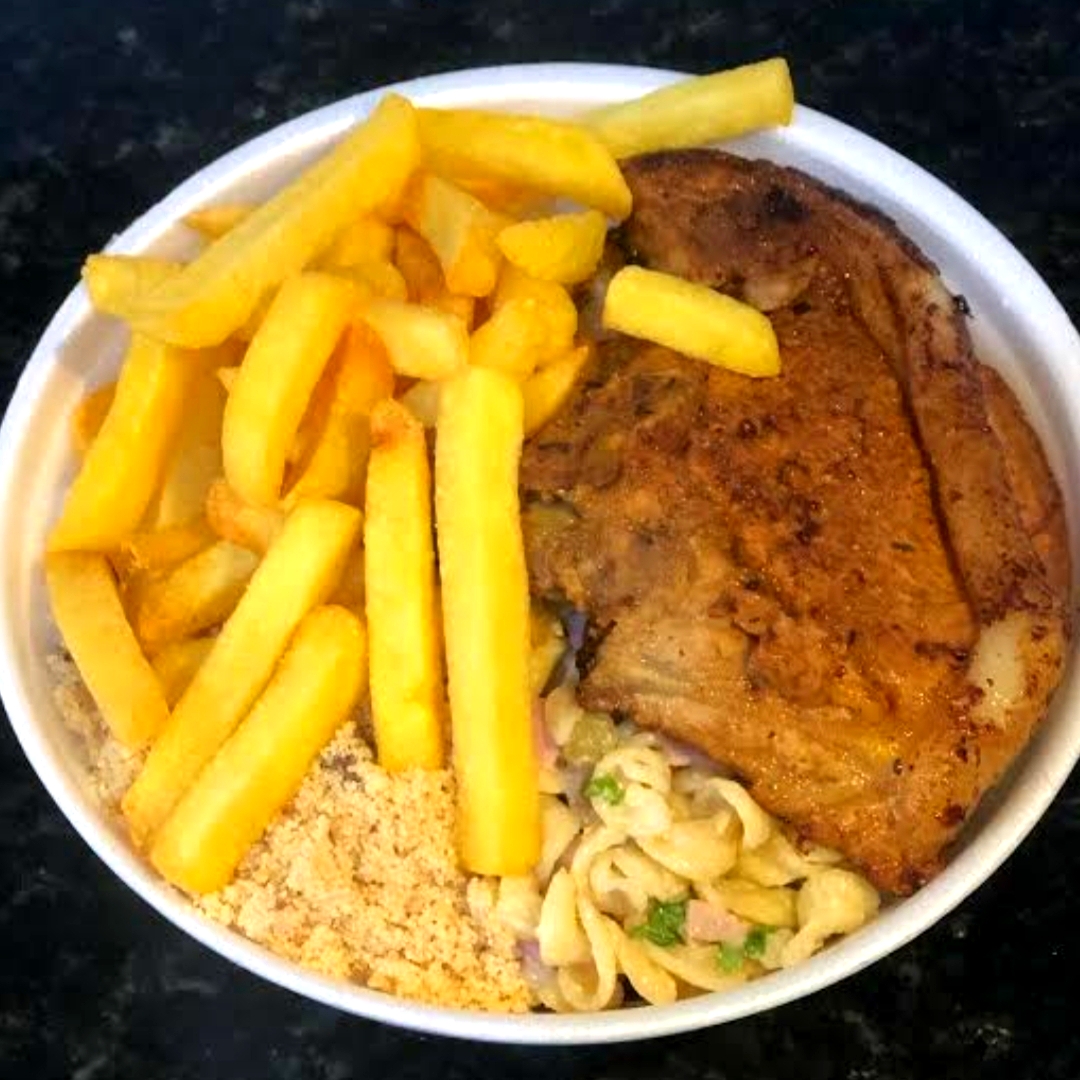Arroz, feijão, macarrão, farofa.(escolher somente 1)purê, batata fritas.
