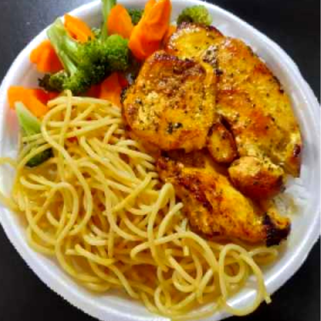 Arroz, feijão, farofa,macarrão.(escolher somente 1)batata fritas, purê,batata coradas, salada de legumes ou maionese.