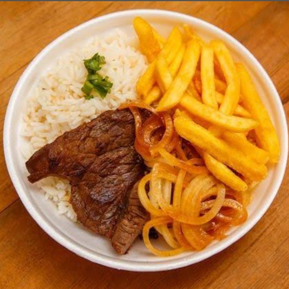 Arroz,feijão, macarrão, farofa, batata fritas ou purê.