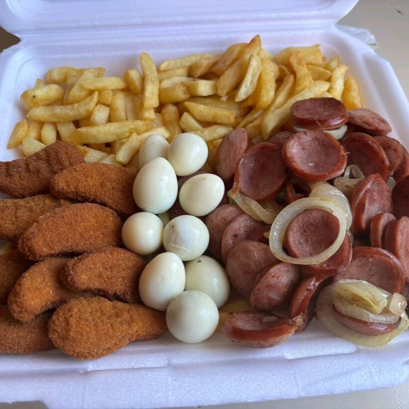 Nuggets, ovo de codorna, linguiça calabresa e batata-frita.
