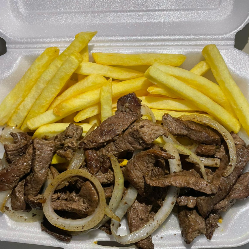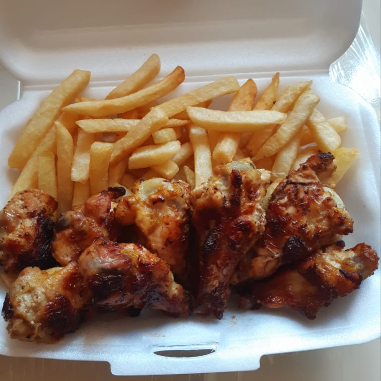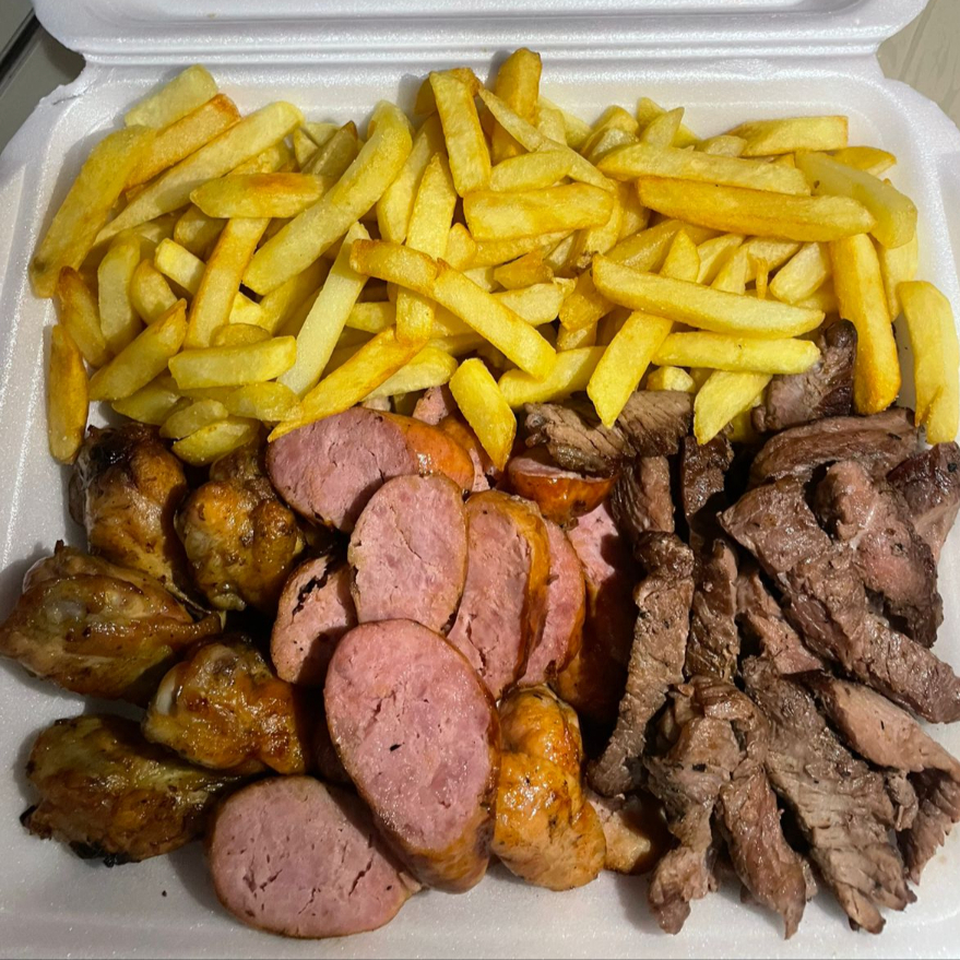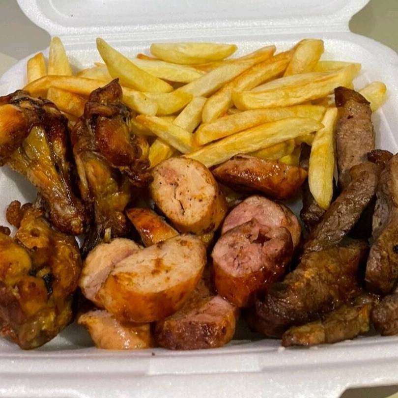 Na brasa- Drumet, Linguiça suina, Linguiça de frango, Alcatra e Batata-frita.