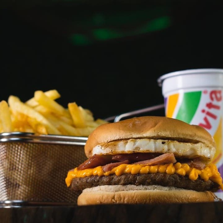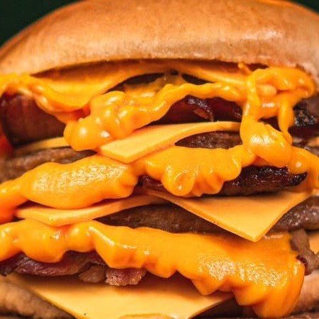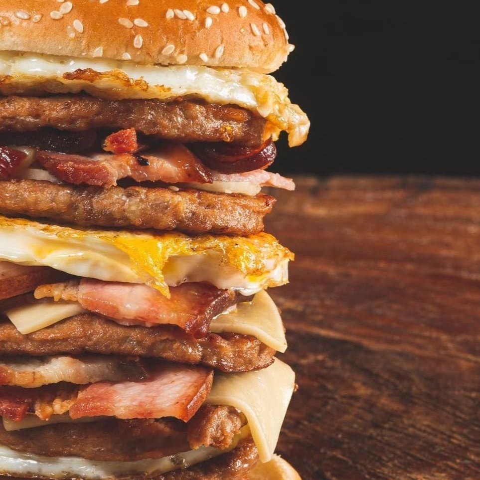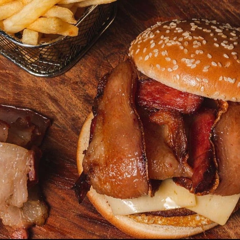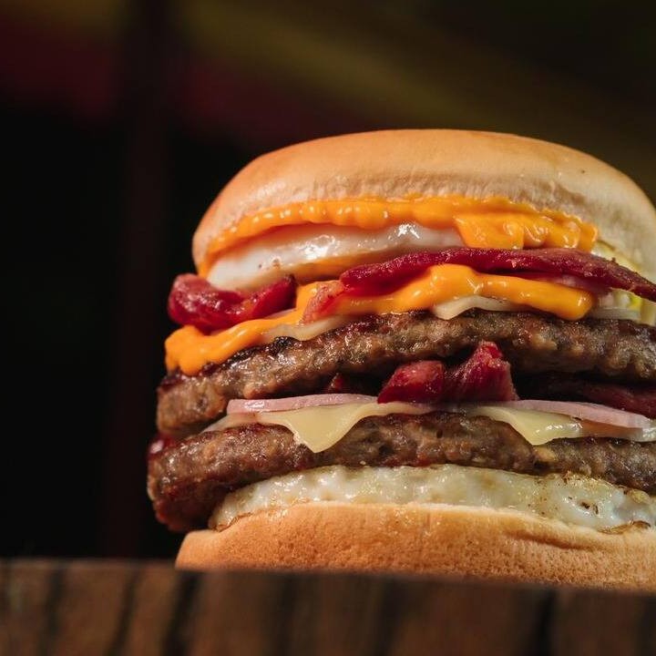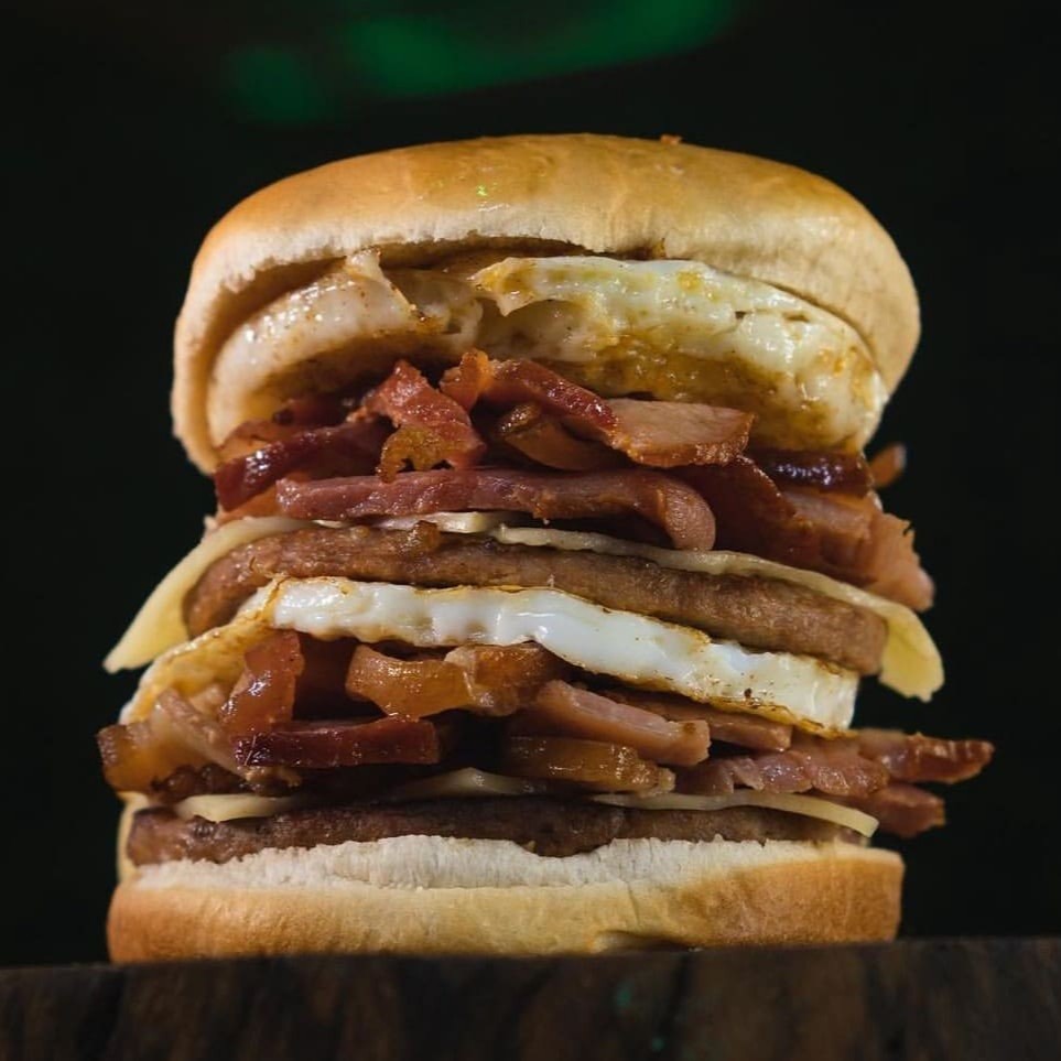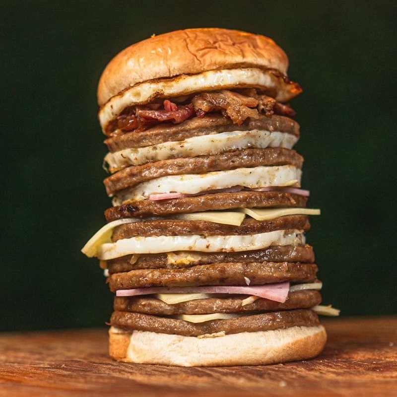 Pão, 2 carnes de picanha, 2 ovos, queijo, presunto, bacon, cheddar cremoso, salada, milho, ketchup, maionese de alho, billy jack, batata palha