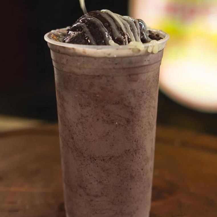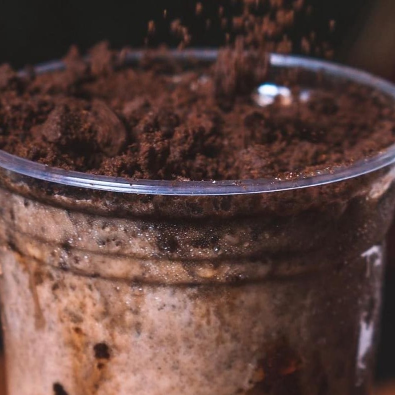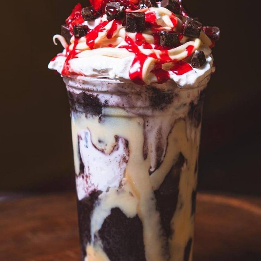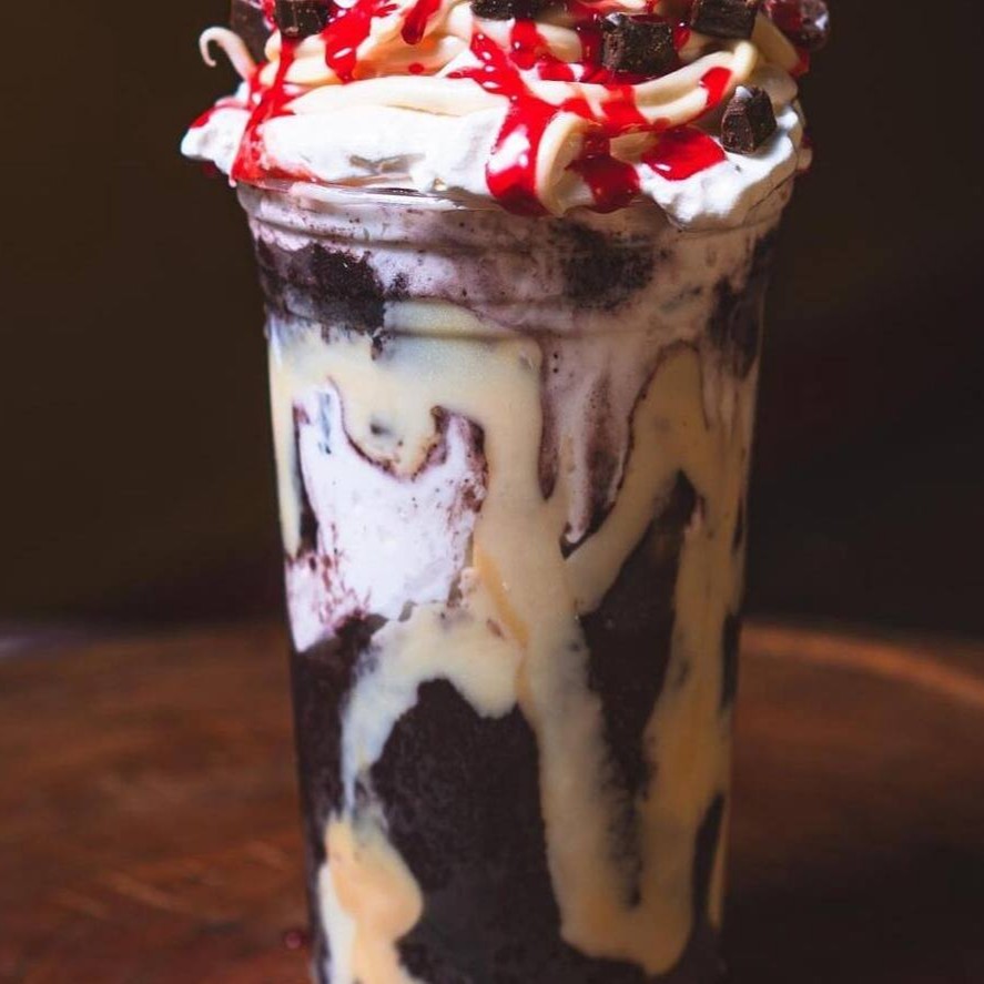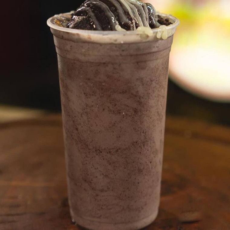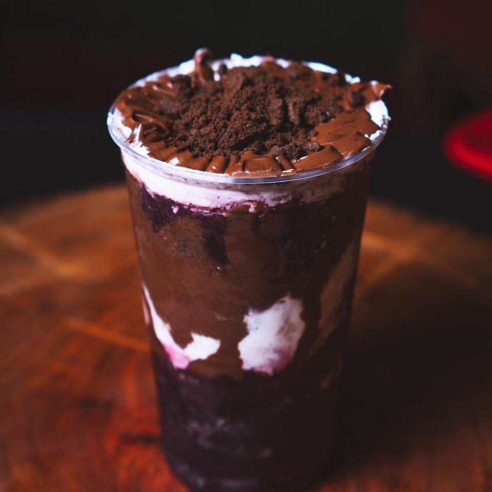 Biscoito Oreo em pedaços, chocolate preto em pedaços, fruta, chantilly e cobertura