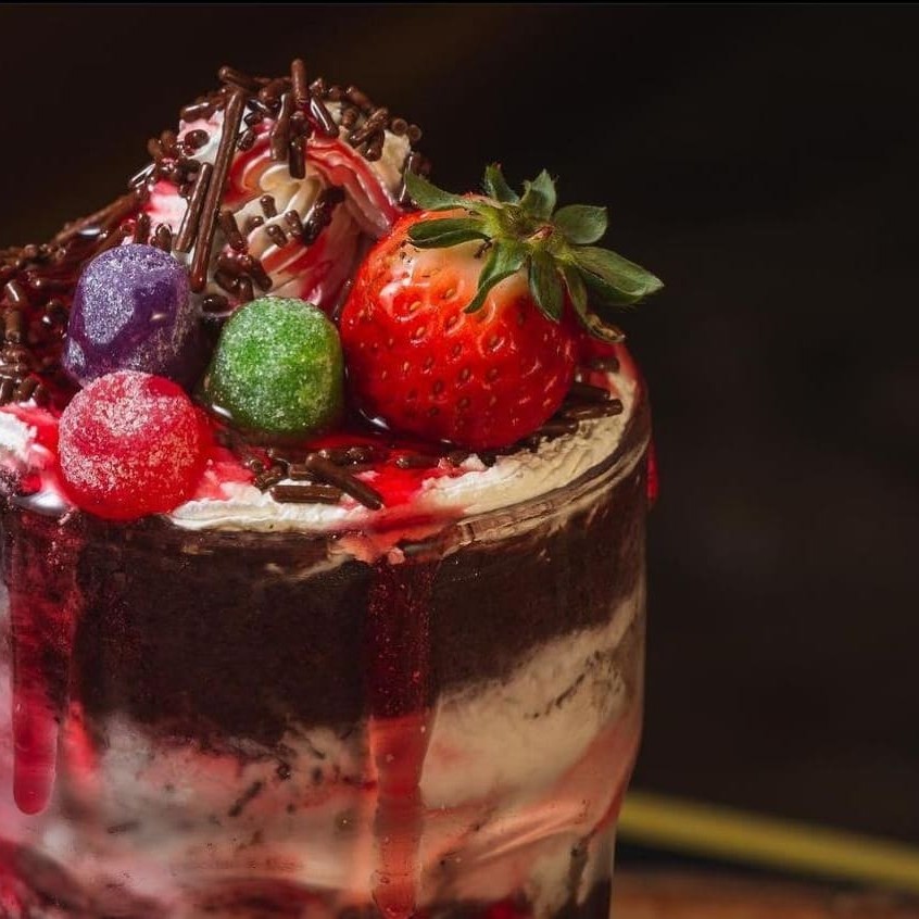 Chocolate Lacta em creme, chocolate Lacta em pedaços, fruta, chantilly e cobertura.