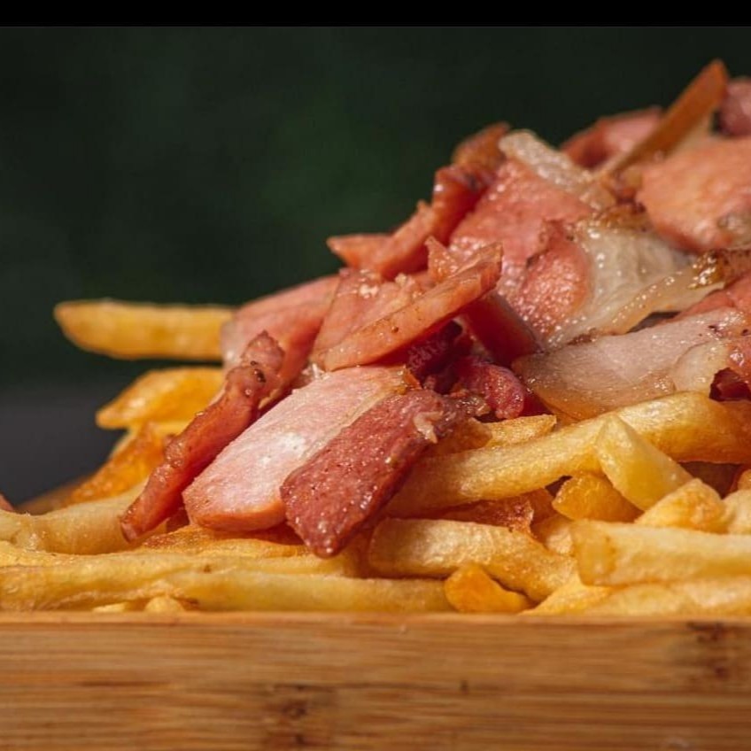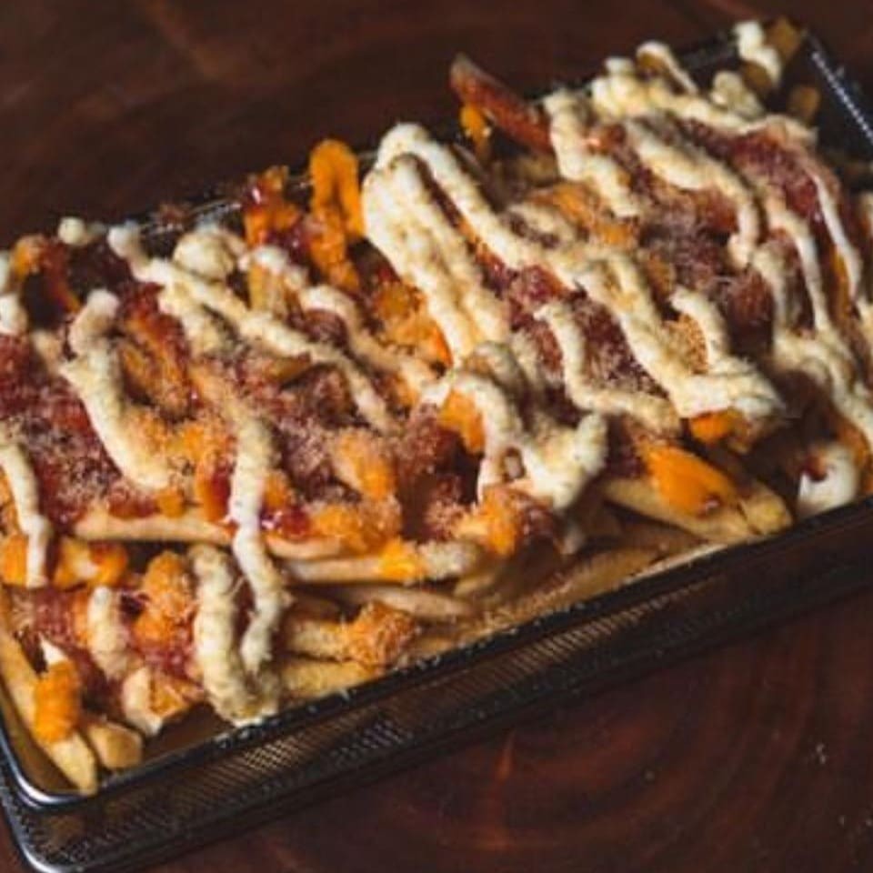 Batata frita com bacon, cheddar, ketchup, maionese e queijo ralado Serve 2 Pessoas
