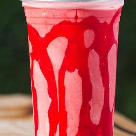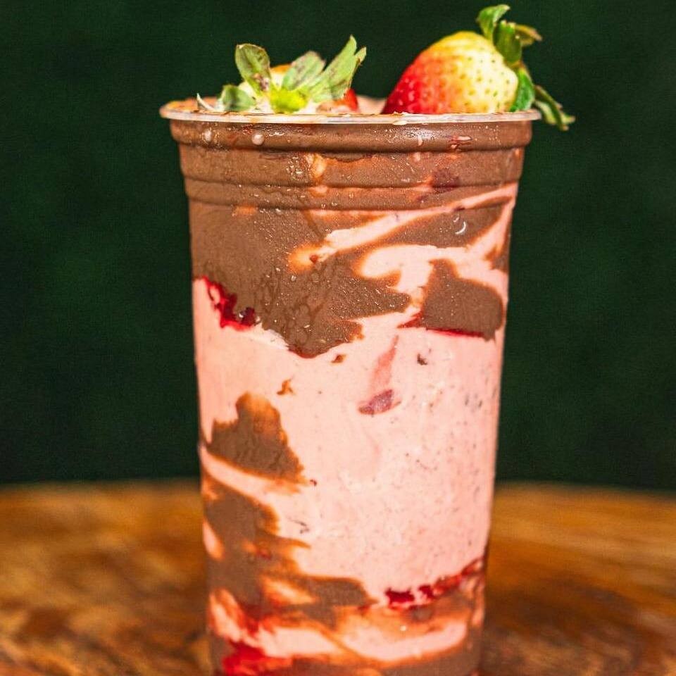 Açaí com leite em pó, paçoca, amendoim, granola, granulado, fruta, chantilly e cobertura