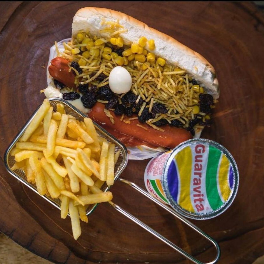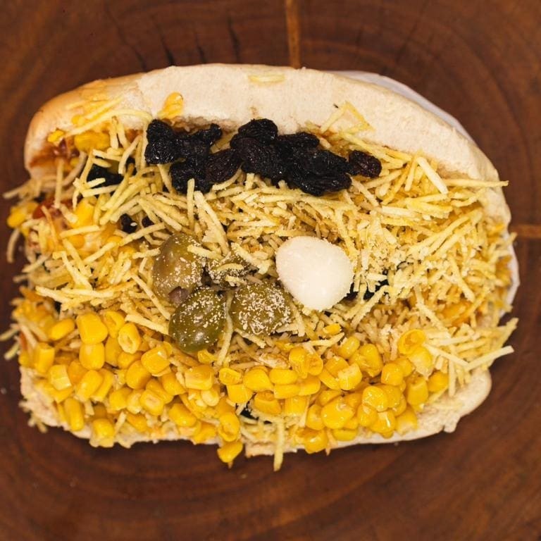 Pão de cachorro-quente, 2 salsichas, milho, passas, azeitona, batata palha, queijo ralado, ovo de codorna, molho de panela, ketchup, maionese de alho e billy jack