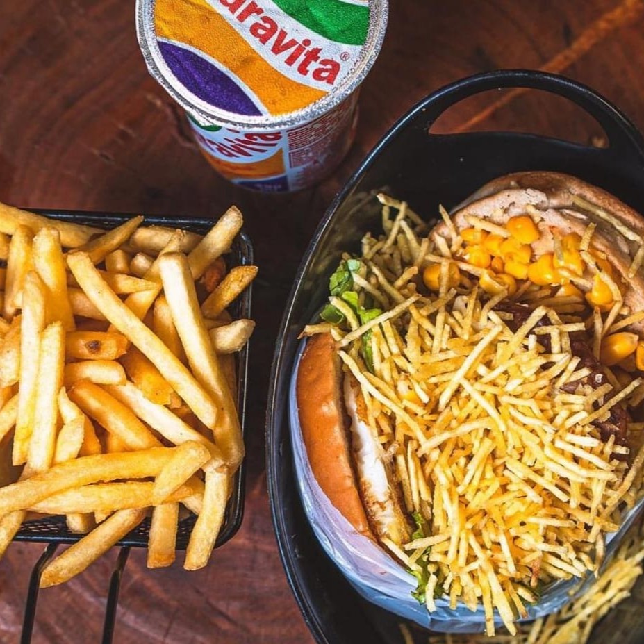Pão, 2 carnes, queijo cheddar, bacon, salada, milho, ketchup, maionese de alho, billy jack e batata palha