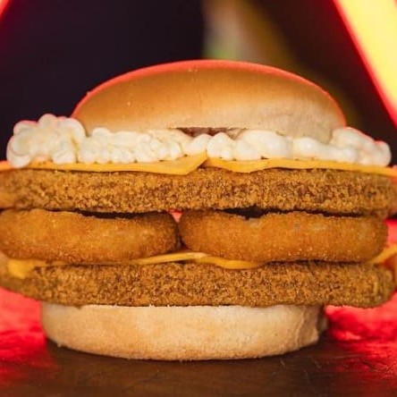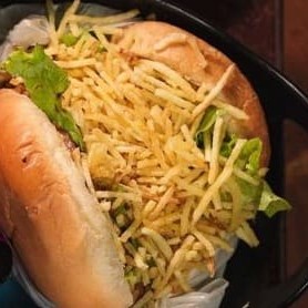 Pão, 2 steak de frango, queijo cheddar, bacon, salada, milho, ketchup, maionese de alho, billy jack e batata palha