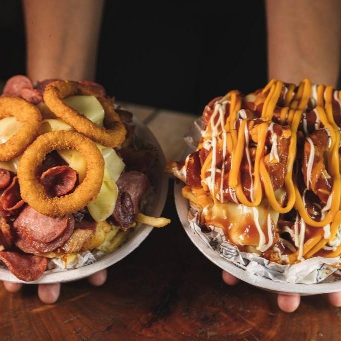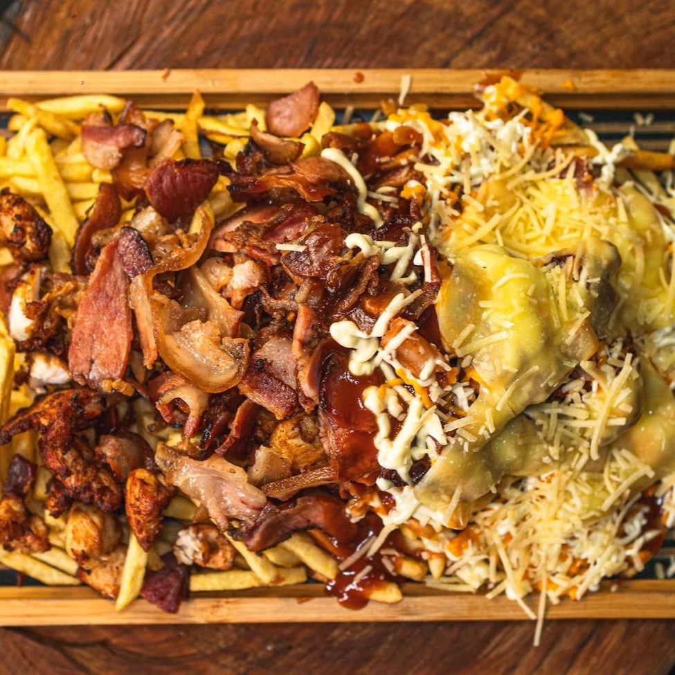 Batata frita com muito frango e muito bacon, cheddar, queijo muçarela, cream cheese, ketchup, maionese e queijo ralado Serve De 3 A 4 Pessoas