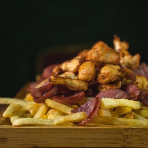 Batata frita com muito frango e muita calabresa, cheddar, queijo muçarela, cream cheese, ketchup, maionese e queijo ralado Serve De 3 A 4 Pessoas
