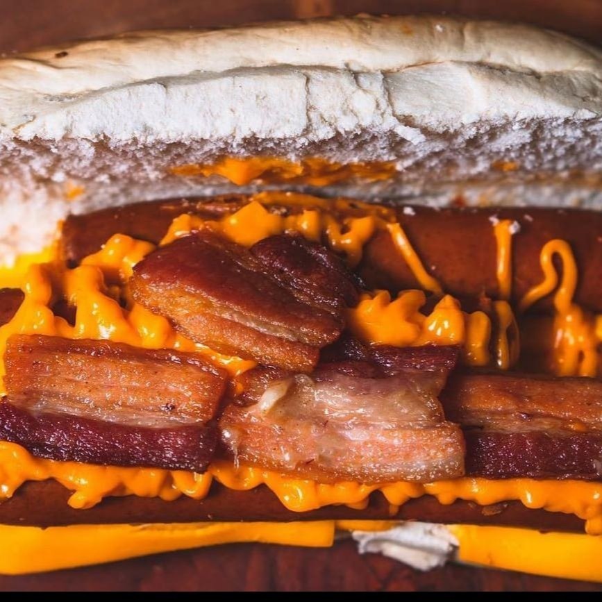 Pão de cachorro-quente na chapa, 2 salsichas, queijo cheddar fatia, queijo cheddar cremoso, bacon, batata palha, ketchup e maionese de alho.