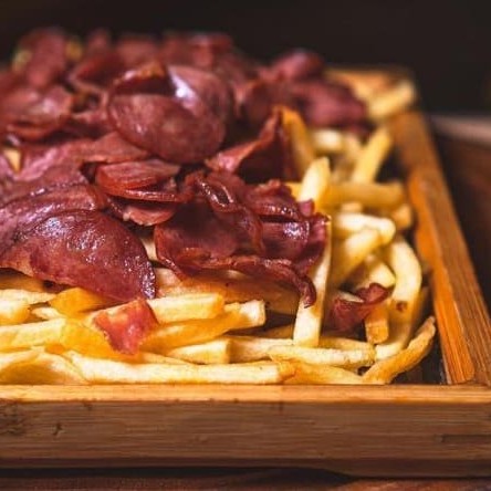 Batata frita com calabresa, cheddar, ketchup, maionese e queijo ralado Serve 2 Pessoas
