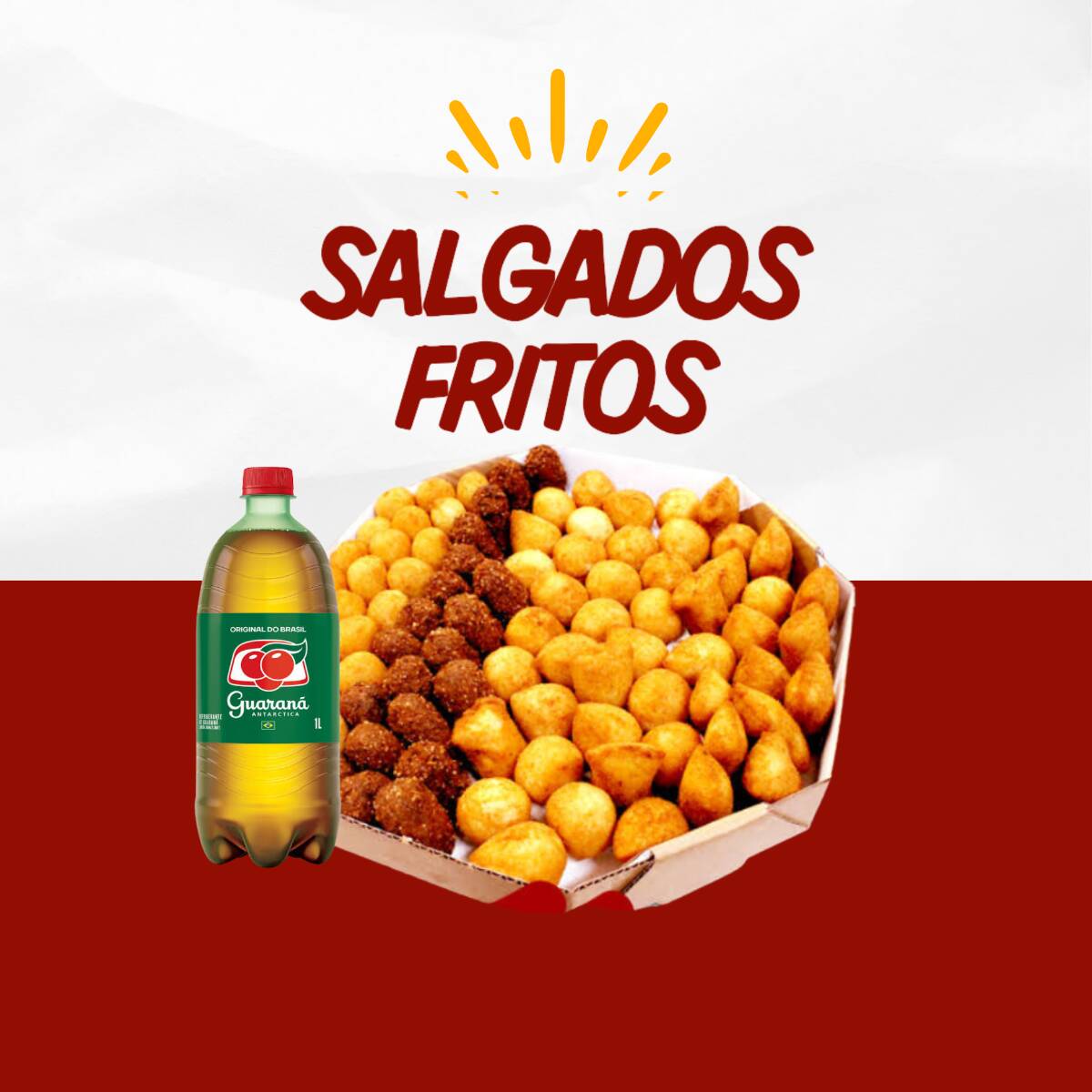 50 salgadinhos + 20 mini pasteis + batata frita 250g + antartica 1,5 l