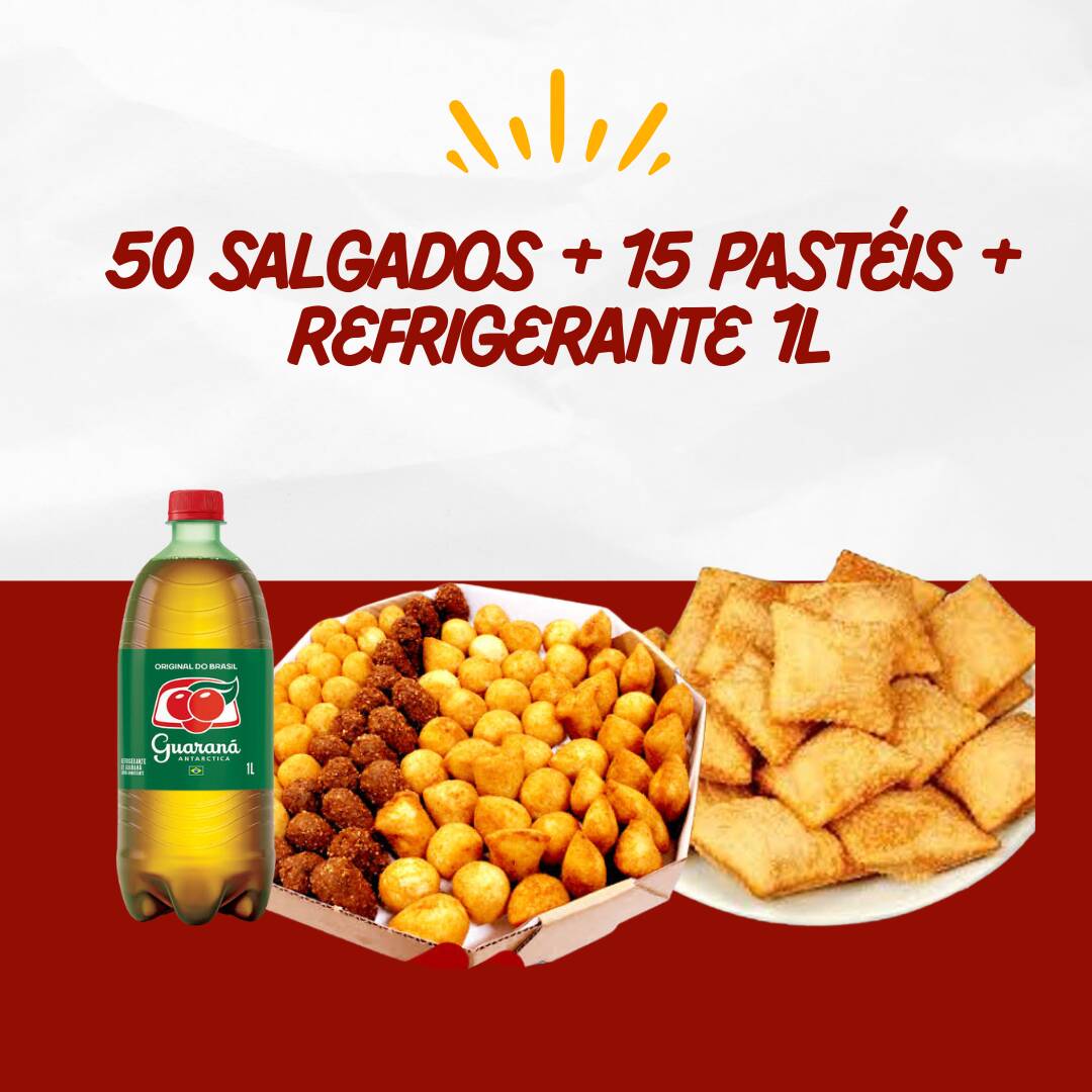 50 Salgadinhos + 15 Pasteis + Refrigerante 1l