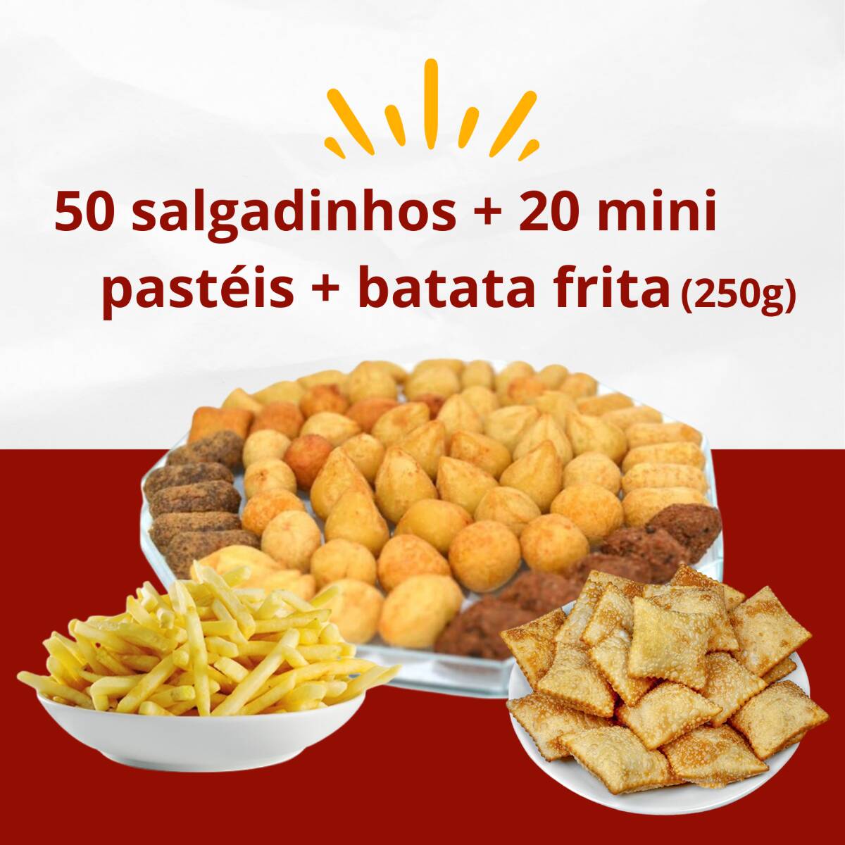 50 Salgadinhos + 20 Mini Pasteis + Batata Frita 250g