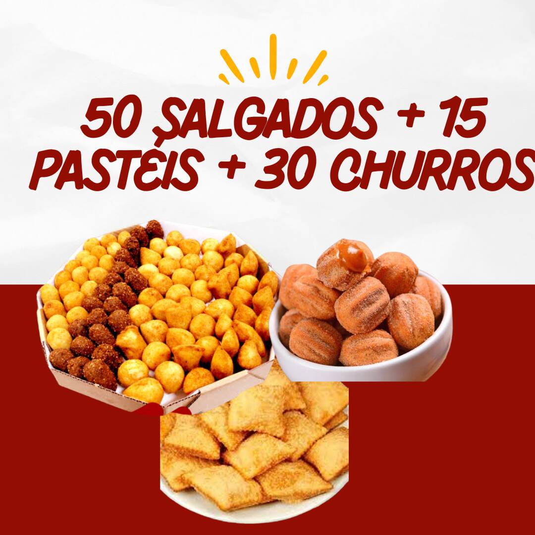 50 Salgadinhos + 15 Pasteis + 30 Churros