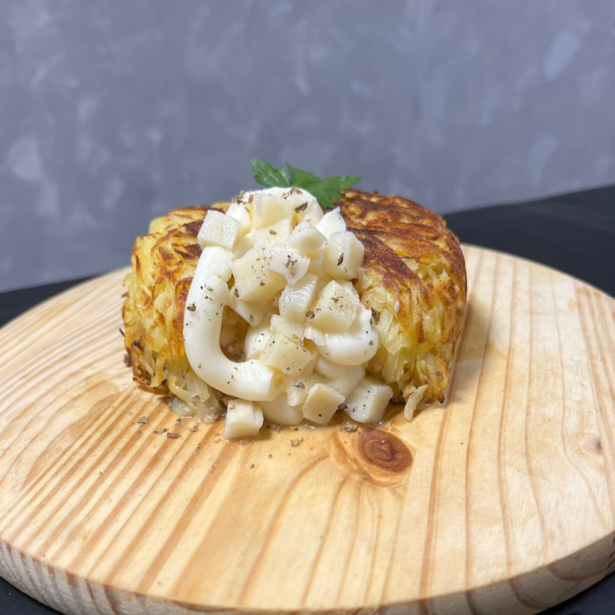 BATATA RALADA TOSTADA NA MANTEIGA COM RECHEIO DE PALMITO COM REQUEIJAO *Podendo incluir junto aos recheios os adicionais*