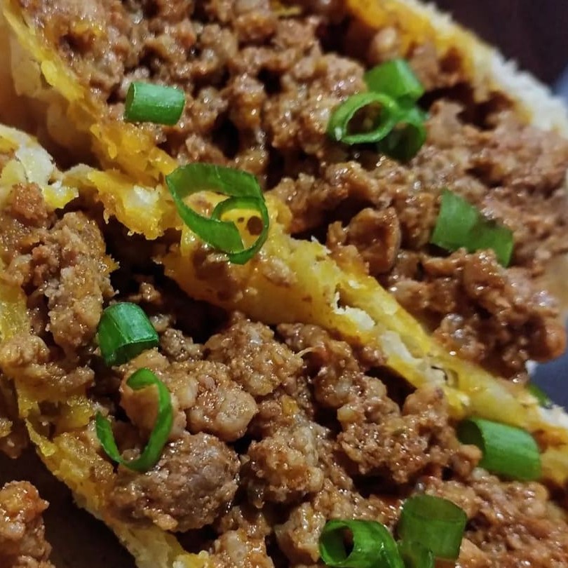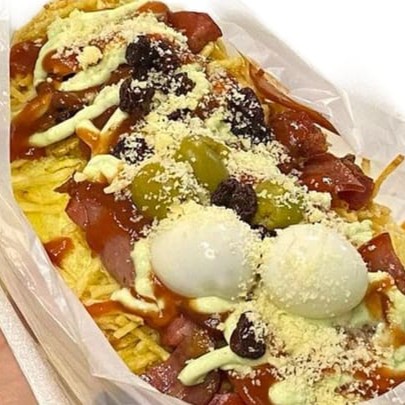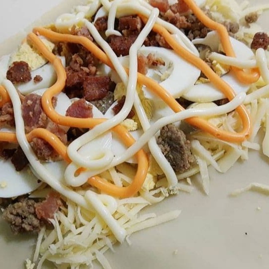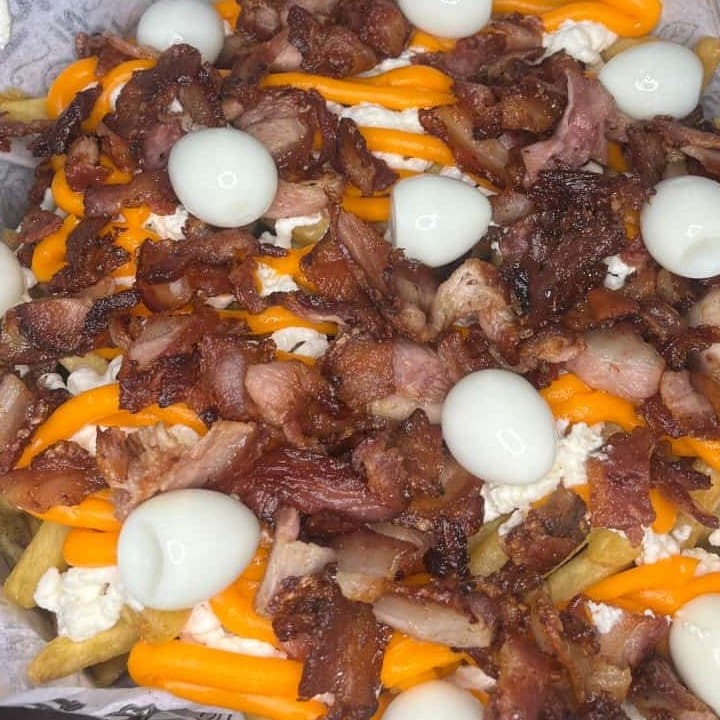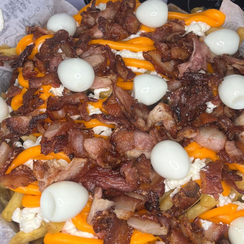 Batata caprichado com ovo de codorna, bacon, cheddar e Catupiry.