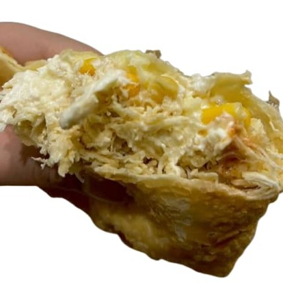 Pastel tem ( 20 Cm ) grande Com muito frango com cheddar, massa crocante pastel muito saboroso e quentinho. Obs: gourmet , crocante & muito bem servido . Vai na caixinha personalizada de pastel muito bem embalado dentro da bolsa craft grampeado. temos todo o carrinho até chegar a casa do cliente .