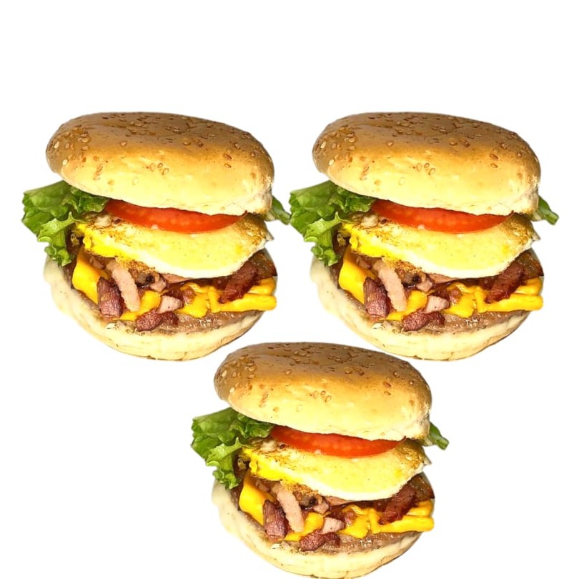 Três x tudos completos com Pão carne queijo ovo bacon calabresa alface tomate e molho especial . X tudos muito bem servidos ...