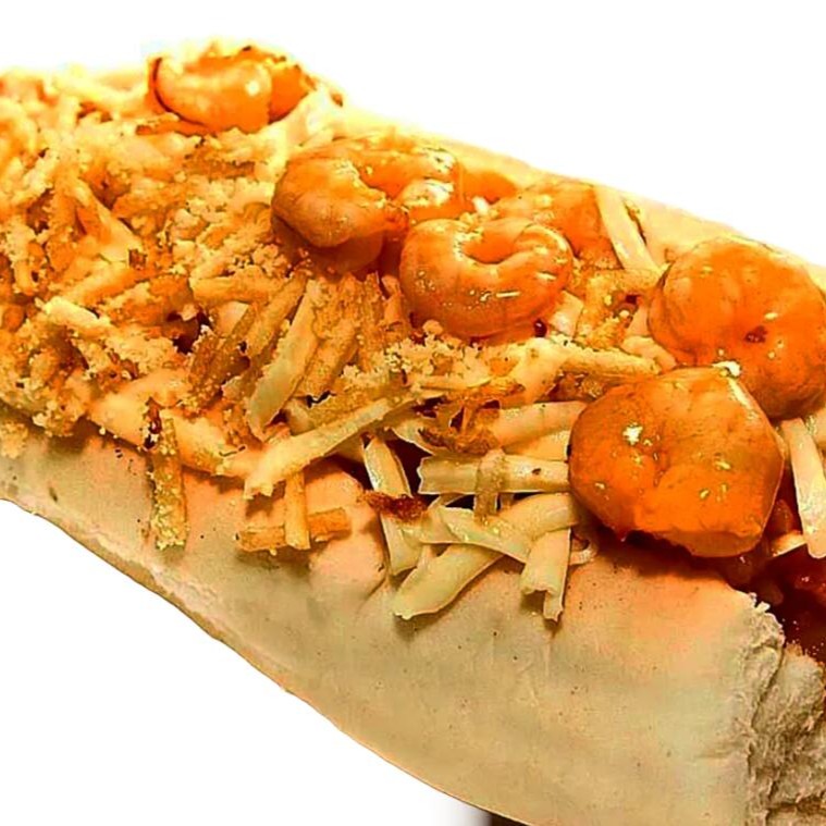 Apresentamos nosso 'Dog de 2 Linguiças com 5 Camarões', um autêntico hot dog gourmet. Este prato é generosamente servido com duas saborosas linguiças e cinco suculentos camarões, tudo coberto com um molho caseiro perfeitamente equilibrado. Acompanha milho, ervilha, azeitonas e passas para um toque de sabor adicional. A crocância da batata palha contrasta perfeitamente com o queijo ralado derretido, o cheddar cremoso e o Catupiry. Para completar, adicionamos bacon e calabresa picados, proporcionando um sabor defumado, e um delicado ovo de codorna. É um cachorro quente de extrema qualidade que certamente deixará você satisfeito. Compre sem medo e desfrute de uma experiência culinária única.