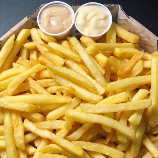 Batata frita tradicional de 25 Cm com potinho de molho . O cliente poder botar os seguintes molhos na batata molho verde , catchup , mostarda , maionese , barbecue .