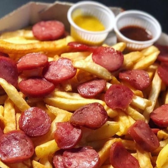 Batata com calabresa de 25 Cm . Boa quantidade de batata no combo de 30 Cm acompanha molho . Batata super crocante com bastante calabresa cheddar.
