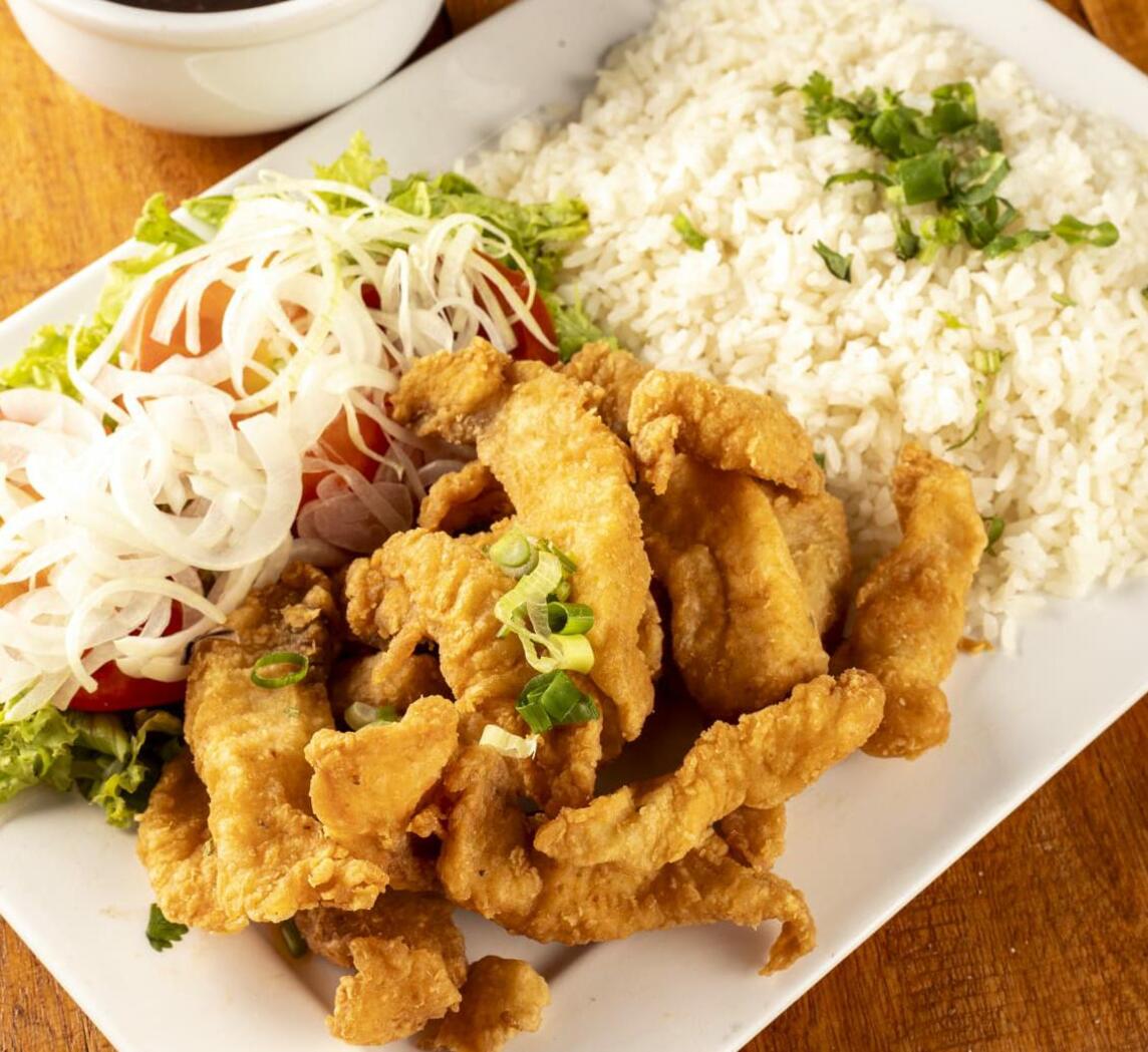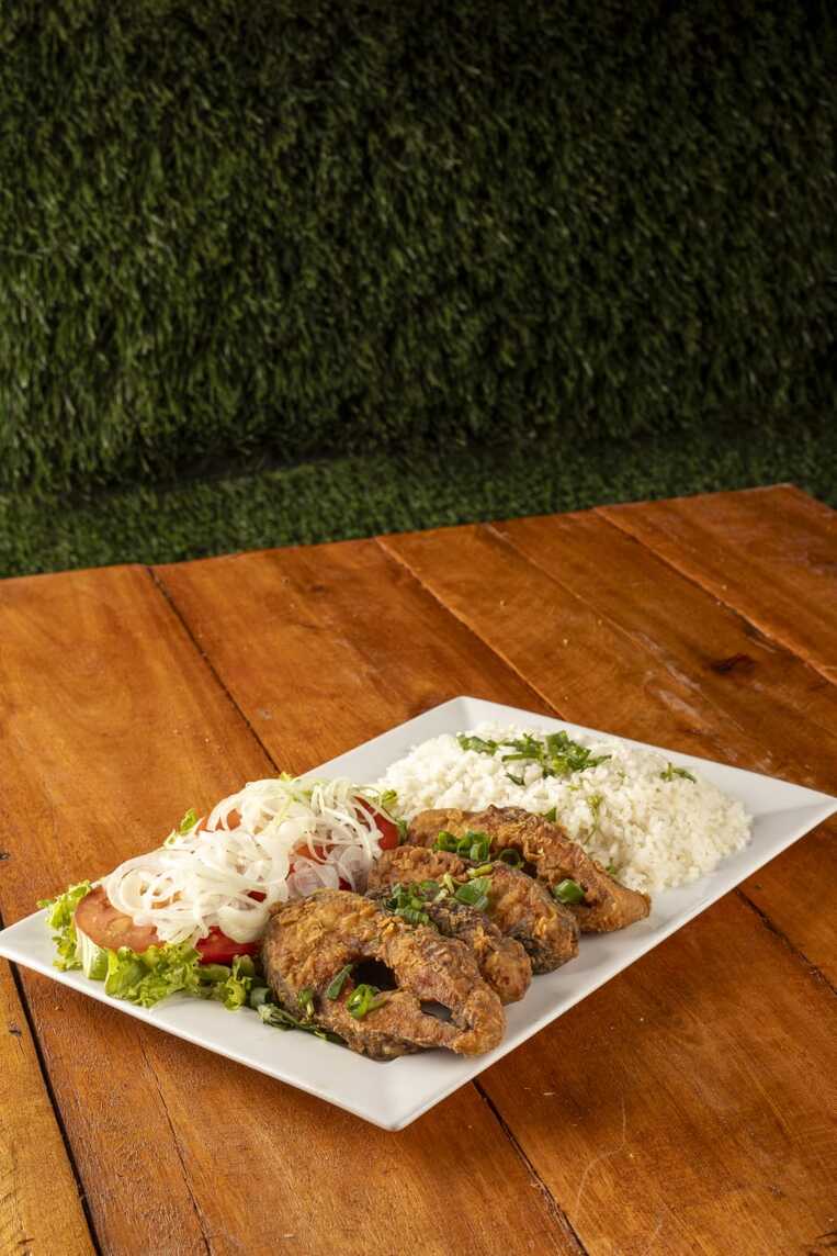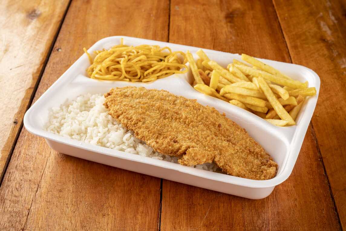 600 gramas de isca de peixe,500 gramas de fritas e salada