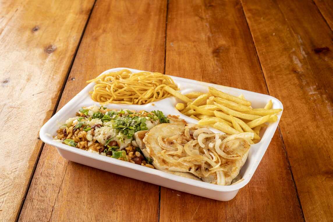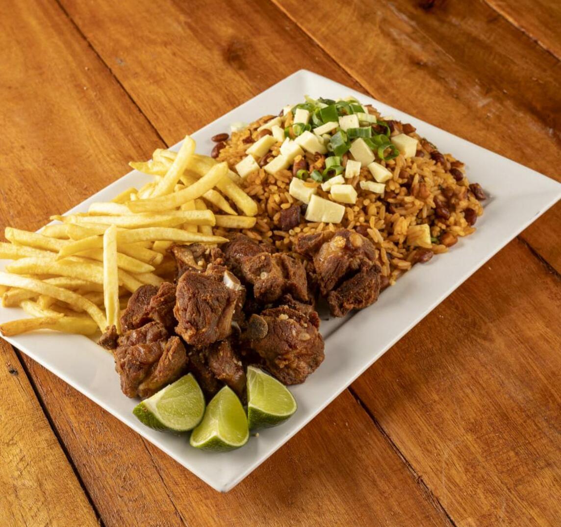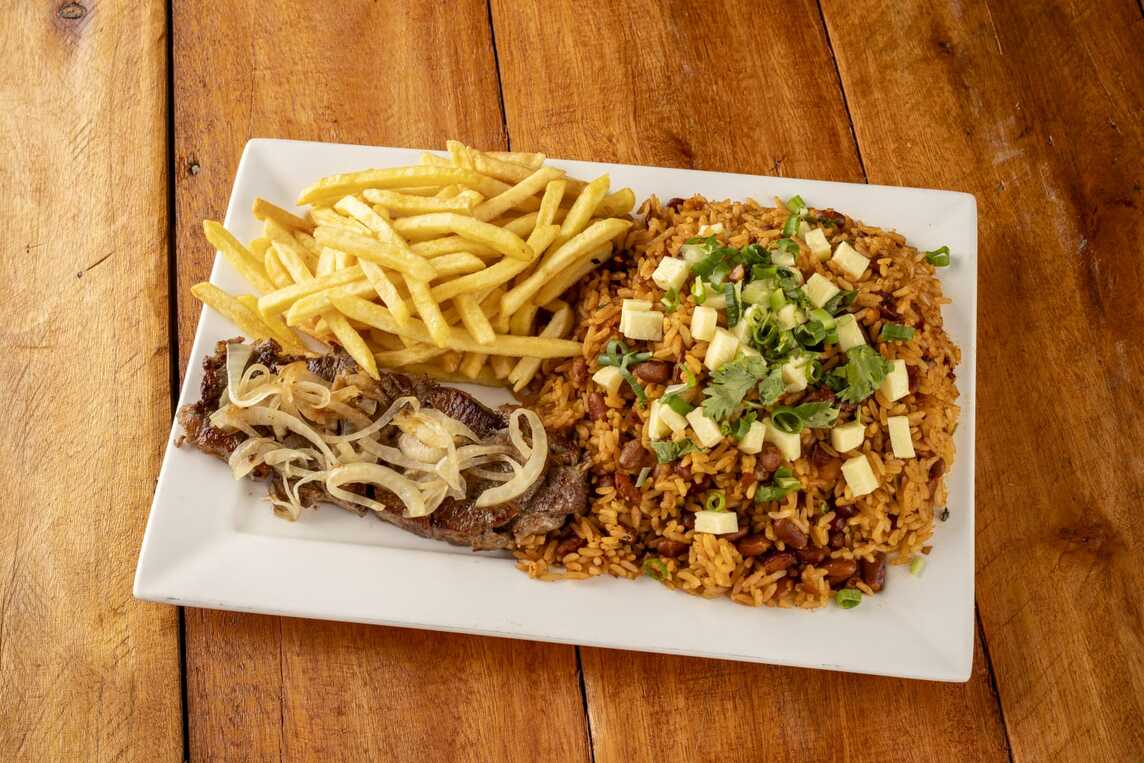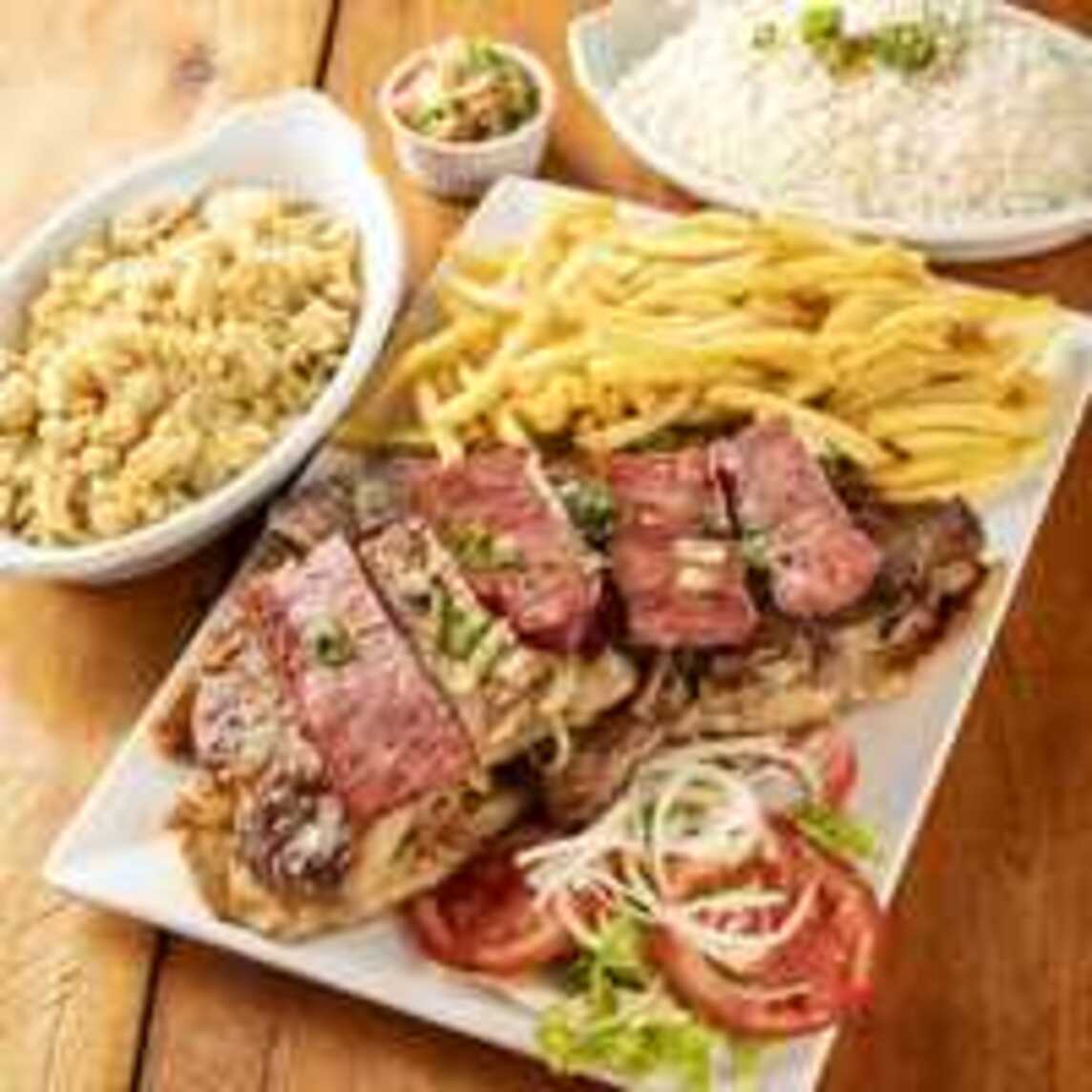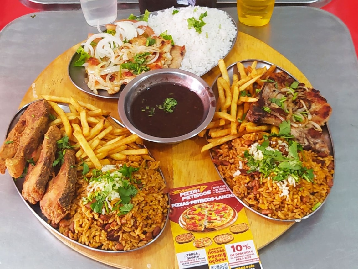 1 bife, 1 carré, 2 filé de frango, 1 linguiça, arroz branco, farofa de ovo, molho a campanha e batata frita