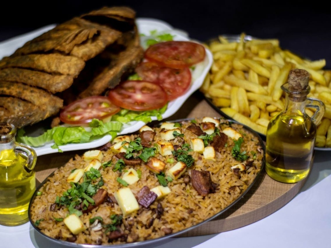 Peixe inteiro, baião de dois, salada e farofa de ovo