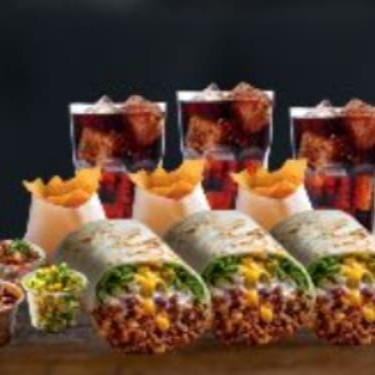 Combo para três pessoas. Três burritos, três porções de nachos regulares, três molhos e três bebidas.