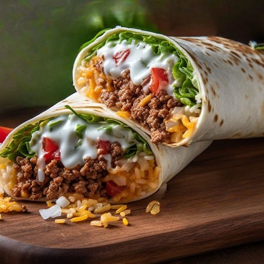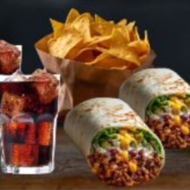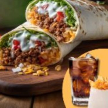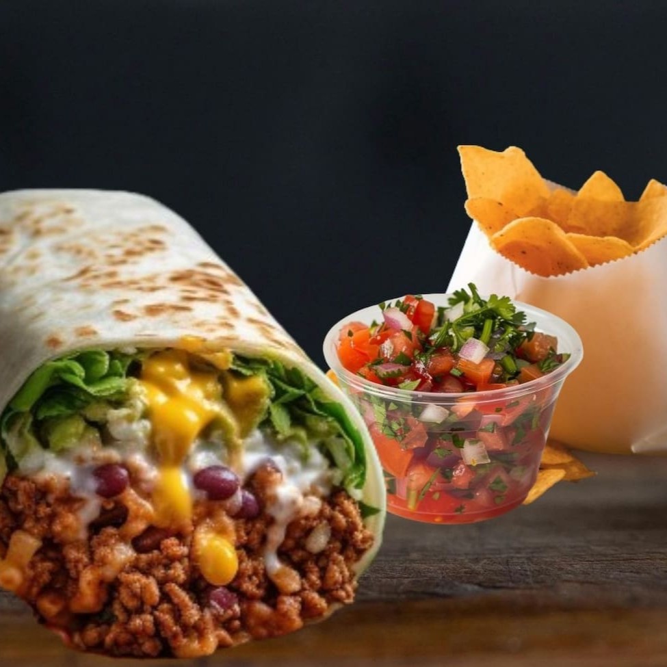 Tortilha de trigo macia recheada com arroz com limão e coentro, feijão refrito, pico de galo, sour cream, alface, queijo e proteína a escolha. Acompanha uma bebida e nachos.
