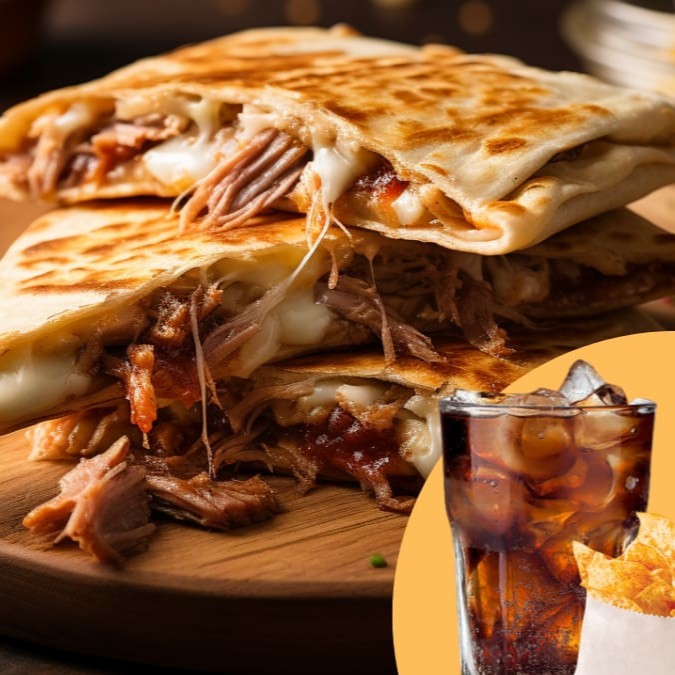 Tortilha de trigo recheada com blend de queijos grelhados e proteína a escolha. Acompanha uma bebida e nachos.
