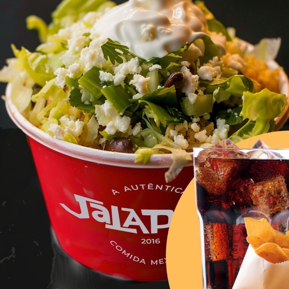Bowl com arroz com limão e coentro, feijão refrito, pico de gallo, sour cream, alface, queijo e proteína a escolha. Acompanha uma bebida e nachos.