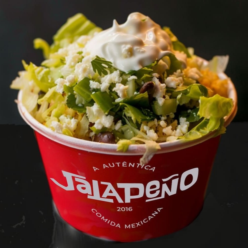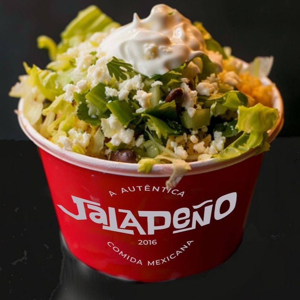 Bowl com arroz com limão e coentro, feijão refrito, pico de gallo, sour cream, alface, queijo e proteína a escolha.