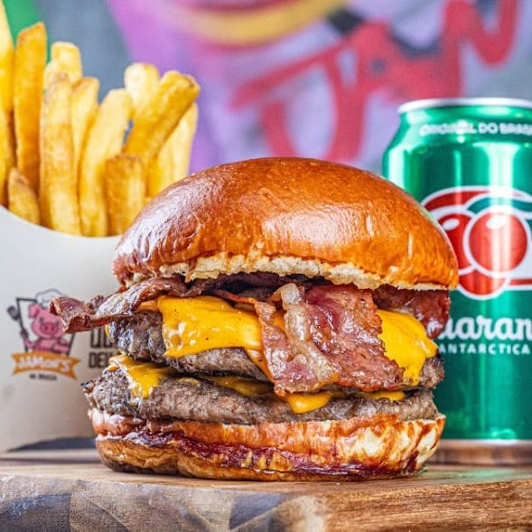 Duplo Cheddar Bacon - O dobro de sabor em um hambúrguer irresistível! Nosso hambúrguer Duplo Cheddar Bacon é uma experiência gastronômica inigualável. Comece com um pão brioche macio, que envolve dois suculentos blends de 130g cada, grelhados no ponto perfeito. Cada camada é coberta com uma generosa fatia de cheddar derretido, que traz um sabor rico e cremoso. E para completar, deliciosas fatias de bacon crocante que elevam esse hambúrguer ao status de obra-prima culinária! Acompanha batata frita e 1 refrigerante lata.